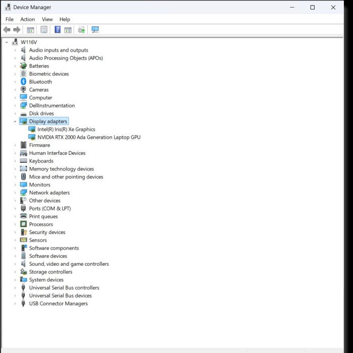 - In the Device Manager window, you will see a list of device categories. Find and click the small arrow (or plus sign) next to Display adapters to expand this section. This will reveal the graphics cards installed on your computer.